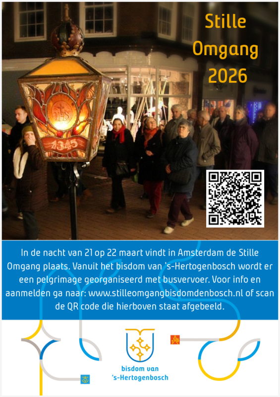 Het bisdom van ‘s-Hertogenbosch gaat op 21 maart 2026 naar de Stille Omgang in Amsterdam. Jaarlijks trekken duizenden mensen vanuit heel Nederland naar de hoofdstad, om de Stille Omgang te volgen, ter herinnering aan het Mirakel van 1345. Zo zullen er ook dit jaar weer vanuit verschillende opstapplaatsen pelgrims vertrekken naar Amsterdam. Ook Bisschop Gerard de Korte gaat dit jaar weer naar de Stille Omgang. In de co-kathedrale basiliek van Sint-Nicolaas vieren we met elkaar de H. Eucharistie. Aansluitend zal de bisschop samen met de pelgrims uit het Bossche bisdom de Stille Omgang lopen. Gaat u ook mee? Mgr. De Korte nodigt u hiervoor van harte uit!